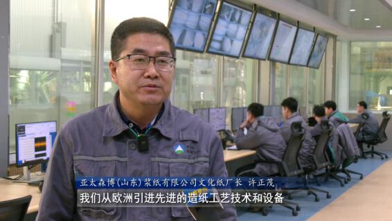 亞太森博(山東)漿紙有限公司文化紙廠長許正茂:我們從歐洲引進先進的造紙工藝技術和設備,該臺紙機是世界上最快的文化紙機之一,設計車速達到每分鐘1800米,整個生產過程實現智能化操作。