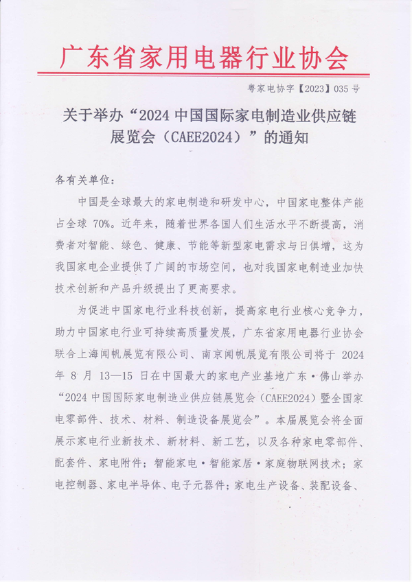 附件:展會概況 一、展會名稱 中國國際家電制造業供應鏈博覽會 全國家電零部件、技術、材料、制造設備展覽會 廣東展:2024年8月13—15日地點:廣東潭洲國際會展中心 合肥展:2024年9月25—26日地點:合肥白金漢爵大酒店 二、展會介紹 中國是全球最大的家電制造和研發中心,中國家電整體產能占全球70%。近年來,隨著世界各國人們生活水平不斷提高,消費者對智能、綠色、健康、節能等新型家電需求與日俱增,這為我國家電企業提供了廣闊的市場空間,也對我國家電制造業加快技術創新和產品升級提出了更高要求。 為促進中國家電行業科技創新,提高家電行業核心競爭力,助力中國家電行業可持續高質量發展,廣東省家用電器行業協會聯合上海聞帆展覽有限公司、南京聞帆展覽有限公司將于2024年8月13—15日在廣東佛山,9月25—26日在安徽合肥舉辦2024中國國際家電制造業供應鏈展覽會(CAEE2024)。本屆展覽會將全面展示家電行業新技術、新材料、新工藝,以及各種家電零部件、配套件、家電附件;智能家電·智能家居·家庭物聯網技術;家電控制器、家電半導體、電子元器件;家電生產設備、裝配設備、生產工藝;包裝設備與包裝材料;家電原輔材料(金屬、塑料、玻璃、電子輔料等);家電研發、家電設計、家電試驗、檢測與認證、OEM加工、家電跨境電商服務、其它家電供應鏈服務商等。 展會同期還將舉辦“家電行業先進制造業技術論壇”、“家電產業鏈融合創新發展論壇”、“家電零部件·技術·材料新品發布會”、“中國家電制造業優秀供應商評選暨頒獎典禮”等系列配套活動,以展覽展示、新品發布、技術交流等活動為平臺,助推中國家電制造業持續引力世界先進水平。 三、展會主旨 促進中國家電制造業科技創新,助力中國家電行業可持續高質量發展 我們的目標是: 幫助供應鏈企業——找到更多買家 幫助家電制造企業——找到更優質供應商 四、組織機構 主辦單位:廣東省家用電器行業協會、上海聞帆展覽有限公司、南京聞帆展覽有限公司 支持企業:海爾集團公司、美的集團股份有限公司、珠海格力電器股份有限公司、西門子家電、美國西屋電氣公司、美國通用家電(GEAppliances)、美國惠而浦公司、博世家用電器集團、日本索尼公司、日本松下電器、東芝(中國)有限公司、韓國三星電子集團、韓國LG集團、日立(HITACHI)家電集團、日本三菱家電、伊萊克斯(Electrolux)中國有限公司、華為技術有限公司、小米科技有限責任公司、TCL實業控股股份有限公司、海信家電集團股份有限公司、康佳集團股份有限公司、長虹電器股份有限公司、奧克斯空調股份有限公司、合肥榮事達電子電器集團有限公司、創維集團有限公司、廣東格蘭仕集團有限公司、澳柯瑪股份有限公司、合肥晶弘電器有限公司、廣東奧馬冰箱有限公司、廣東萬和新電氣股份有限公司、廣東萬家樂燃氣具有限公司、寧波方太廚具有限公司、華帝股份有限公司、杭州老板電器股份有限公司、無錫小天鵝電器有限公司、科沃斯機器人公司、云鯨智能科技公司、石頭科技公司、追覓科技公司、iRobot機器人公司、曉舞掃地機器人公司等。 五、展會規模 參展企業:500+ 參觀觀眾:30000+ 展覽面積:30000㎡+ 六、VIP觀眾及特邀采購商 全球5萬多名專業觀眾和采購商,主要來自全國家電制造企業采購、技術、研發、設計、生產、工程等負責人、部門經理、采購經理、工程師、技術員、設計師、研發人員等:包括海爾、美的、格力、海信、TCL、康佳、長虹、華為、小米、創維、奧克斯、博世、西門子、松下電器、索尼、東芝、三星、LG、日立、三菱、三洋、夏普、飛利浦、西屋電氣、榮事達、格蘭仕、容聲、美菱、澳柯瑪、奧瑪、大金空調、小天鵝、小鴨、德意電器、海立電器、惠而浦、遠大、美大、森歌、方太、老板、華帝、帥康、櫻花廚衛、帥豐、德意、火王、阿里斯頓、林內、前鋒、蘇泊爾、九陽、萬和、萬家樂、AO史密斯、云米、萊克、愛仕達、艾美特、伊萊克斯、伊萊特、索伊、小熊電器、白雪電器、安吉爾、凈美仕、易開得、沁園、3M凈水、霍尼韋爾凈水、科勒、濱特爾凈水、阿詩丹頓、安之源、沁源、漢斯頓、阿里斯頓、布魯雅爾、亞都、戴森、綠島風、紐恩泰、中廣歐特斯、正理生能、芬尼克茲、科沃斯、云鯨、石頭科技、追覓、一點、曉舞、艾羅伯特等。 七、同期技術論壇——誠邀發言嘉賓 展會舉辦多場次高端家電技術論壇,屆時組委會將邀請國內外家電領域的知名專家、家電制造企業、供應鏈企業、媒體記者參加,就全球家電發展趨勢、家電新技術、新材料、新工藝的應用進行廣泛的交流和探討。組委會現面向全球誠邀大會發言嘉賓。 中國家電科技與創新大會 中國智能家電·智能家居技術論壇 中國家電新材料、新工藝、新技術推廣與應用論壇 中國家電行業先進制造技術論壇 八、參展范圍 家電新技術·新材料·新工藝 家電零部件、配套件、附件、結構件 智能家電·智能家居·家庭物聯網技術 家電控制器、電子元器件、芯片 外觀件、塑料件、鈑金件、五金件 家電制造與裝配技術設備 家電包裝技術設備與包裝材料 家電原輔材料(金屬、塑料、玻璃、磁材、電子材料等) 家電研發與家電設計 家電試驗與測試技術設備 檢測與認證服務 OEM加工 跨境電商服務