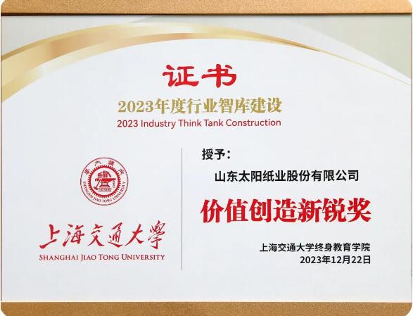 近日,上海交通大學舉辦2023年度行業(yè)智庫建設論壇暨頒獎盛典,太陽紙業(yè)憑借卓越表現(xiàn)榮獲上海交通大學2023年度行業(yè)智庫建設價值創(chuàng)造新銳獎。