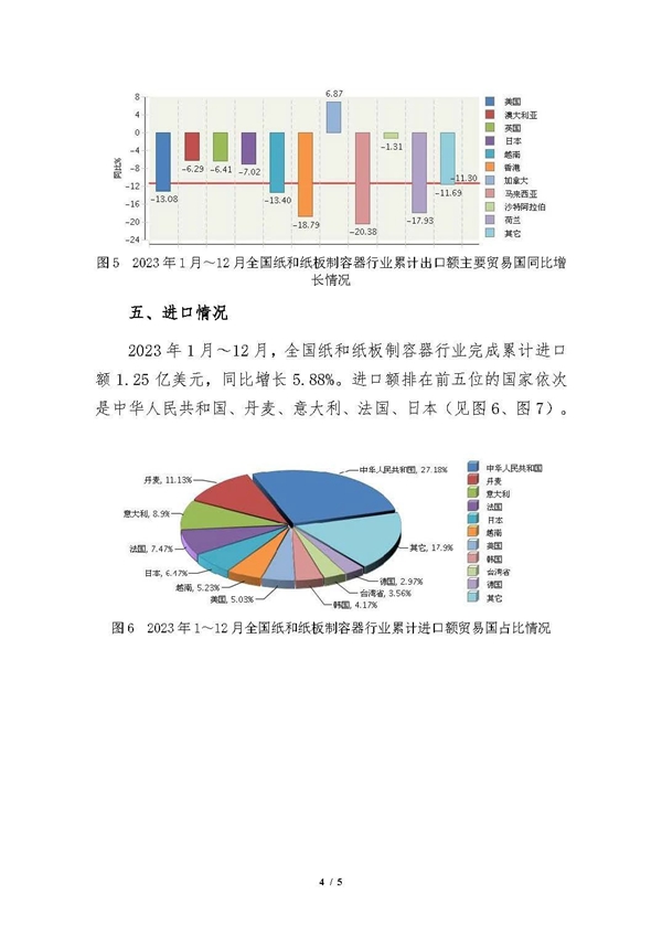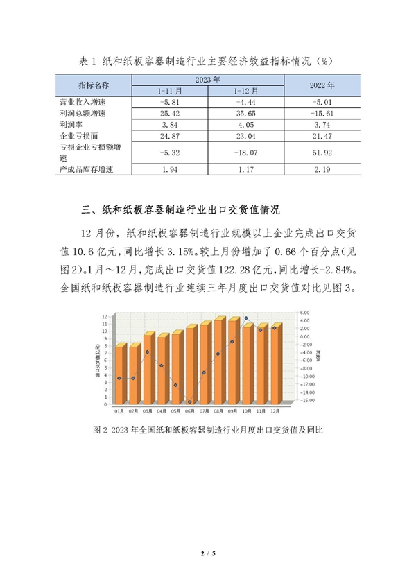 日前,中國包裝聯合會公布了《2023年12月紙和紙板容器行業經濟運行簡報》。 數據顯示,2023年1月-12月,全國紙和紙板容器制造行業累計完成主營業務收入2682.57億元,同比增長-4.44%。其中,12月份完成主營業務收入270.32億元,同比增長9.77%。 在主要經濟效益指標方面,2023年1月-12月,全國紙和紙板容器制造行業累計完成利潤總額108.67億元,同比增長35.65%;累計主營業務收入利潤率為4.05%,同比增長1.20%;累計虧損面為23.04%,同比增長1.14%。 2023年12月紙和紙板容器行業經濟運行簡報