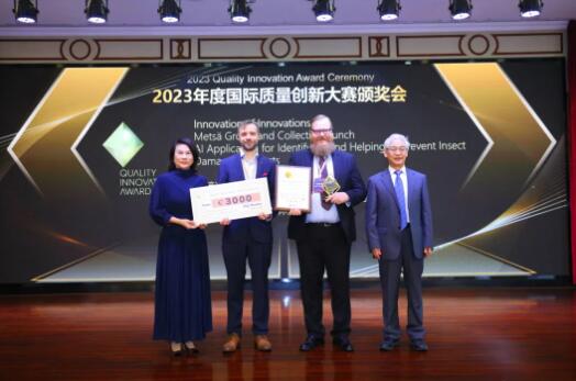 中國質量協會會長賈福興(右一)和副會長、格力電器董事長兼總裁董明珠(左一)為識別和幫助預防森林蟲害的AI應用聯合獲獎團隊(左二,芬林集團林業高級副總裁OlliLeino;右二,CollectiveCrunch首席執行官JuhaKoponen)頒發特等獎