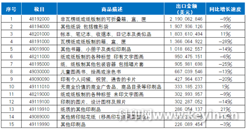 表32023年國內出口金額超過2億美元的印刷品 出版物印刷品 2023年國內出版物印刷品出口17.33億美元(同比下降13%)。其中,書籍/字典類印刷品10.54億美元(同比下降13%)、期刊/報紙類印刷品911.90萬美元(同比增長28%)、兒童圖畫書類印刷品6.67億美元(同比下降13%)、其他出版物印刷品286.26萬美元(同比下降22%)。書籍/字典類印刷品和兒童圖畫書類印刷品出口占國內出版物印刷品出口總金額的比重達99%(參見表1)。 同期,出版物印刷品出口金額超過2億美元的稅目商品有2個(參見表3): 其他書籍、小冊子及類似印刷品(稅目49019900) 出口金額10.19億美元(同比下降14%)。居出口金額前五位的國家(地區(qū))有,美國(4.63億美元)、中國香港(1.57億美元)、英國(6906.07萬美元)、澳大利亞(3168.49萬美元)、荷蘭(2331.46萬美元); 兒童圖畫書及繪畫或涂色書(稅目49030000) 出口金額6.67億美元(同比下降13%)。居出口金額前五位的國家(地區(qū))有,美國(2.50億美元)、英國(6839.25萬美元)、中國香港(6569.82萬美元)、法國(3105.47萬美元)、德國(2993.55萬美元)。 包裝裝潢印刷品 2023年國內包裝印刷品出口79.71億美元(同比下降15%)。其中,瓦楞紙箱13.66億美元(同比下降28%)、非瓦楞折疊紙盒21.90億美元(同比下降9%)、紙袋19.44億美元(同比下降9%)、其他紙質包裝容器9.60億美元(同比下降24%)、標簽12.53億美元(同比下降7%)、轉印貼花紙2.57億美元(同比下降9%)。六個品種出口占包裝裝潢印刷品出口總金額的比重分別為17%、27%、24%、12%、16%、3%。 同期,國內包裝裝潢物印刷品出口金額超過2億美元的稅目商品有7個(參見表3): 非瓦楞紙或紙板制的可折疊箱/盒(稅目48192000) 出口金額21.90億美元(同比下降9%)。居出口金額前五位的國家(地區(qū))有,美國(4.19億美元)、澳大利亞(1.30億美元)、馬來西亞(1.10億美元)、中國香港(1.06億美元)、越南(9288.95萬美元)。