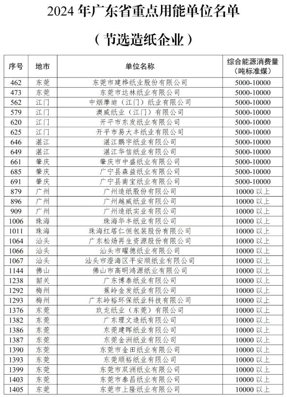 近日,廣東省能源局、廣東省統(tǒng)計局發(fā)布《2024年廣東省重點用能單位名單》,全省共有1912家重點用能單位,年綜合能源消費量超過10000噸(含)標準煤的重點用能單位1120家,年綜合能源消費量在5000噸(含)至10000噸(不含)標準煤的重點用能單位792家。其中多家造紙企業(yè)被列入該名單,下附企業(yè)名單。