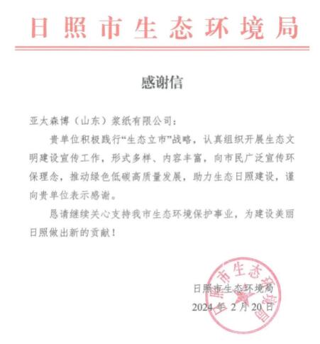 今年2月份,日照市生態(tài)環(huán)境局向亞太森博發(fā)來感謝信,對公司積極踐行“生態(tài)立市”戰(zhàn)略、認真組織生態(tài)文明建設(shè)宣傳工作、向市民廣泛宣傳環(huán)保理念、推動城市綠色低碳高質(zhì)量發(fā)展、助力生態(tài)日照建設(shè)等方面的貢獻表示感謝。