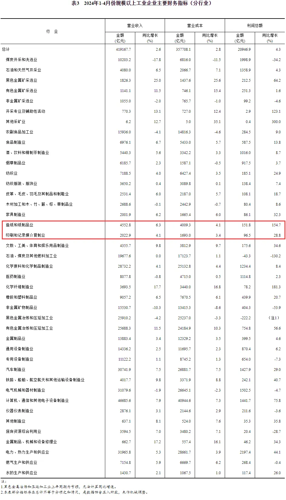在41個(gè)工業(yè)大類行業(yè)中,造紙和紙制品業(yè)2024年1-4月實(shí)現(xiàn)利潤(rùn)總額151.8億元,同比增長(zhǎng)154.7%;印刷和記錄媒介復(fù)制業(yè)2024年1-4月實(shí)現(xiàn)利潤(rùn)總額96.5億元,同比增長(zhǎng)28.8%。