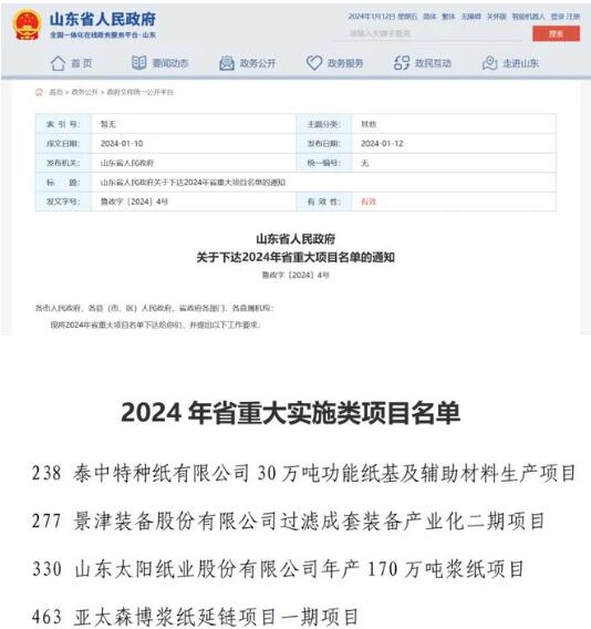2024年是促進經濟鞏固向好、加快綠色低碳高質量發展的關鍵之年,山東大力推進重大產業項目和重點項目建設。山東省多家企業的大型漿紙、裝備項目入圍省政府發布的2024年省重大項目名單和省發改委發布的2024年省綠色低碳高質量發展重點項目名單。