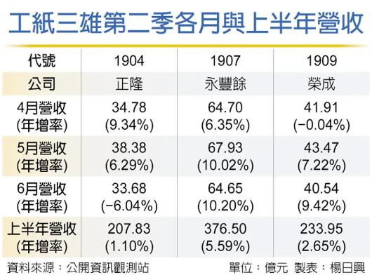 臺(tái)灣造紙三雄營(yíng)運(yùn)穩(wěn)健 據(jù)了解,相較去年,工紙市況在今年逐步好轉(zhuǎn),第二季的整體需求又優(yōu)于首季。大陸工紙需求、價(jià)格亦持續(xù)改善,造紙三雄進(jìn)入第二季后業(yè)績(jī)有更明顯改善。 榮成紙業(yè):自結(jié)6月?tīng)I(yíng)收40.54億元、年增9.42%;上半年?duì)I收233.95億元、年增2.65%,稅前凈利歸屬母公司業(yè)主1.55億元。 正隆紙業(yè):6月?tīng)I(yíng)收33.68億元、年減6.04%,上半年?duì)I收207.83億元、年增1.1%。 永豐余:6月?tīng)I(yíng)收64.65億元、年增10.2%,上半年?duì)I收376.5億元、年增5.59%。 尤其是6月大陸市場(chǎng)在下游紙箱廠補(bǔ)庫(kù)存拉貨動(dòng)能提振下,工紙廠的出貨狀況整體優(yōu)于市場(chǎng)預(yù)期,庫(kù)存有效降低,亦帶動(dòng)在大陸有工紙產(chǎn)能布局的榮成、永豐余6月?tīng)I(yíng)運(yùn)有較大增長(zhǎng)。 此外,永豐余也受益于多角化經(jīng)營(yíng)推動(dòng),其主要事業(yè)體6月?tīng)I(yíng)收多有成長(zhǎng),其旗下的華紙6月?tīng)I(yíng)收17.25億元、年增7.27%,上半年?duì)I收106.89億元、年增1.64%。 樂(lè)觀看待下半年市場(chǎng) 對(duì)于下半年工紙市況,正隆紙業(yè)看好傳統(tǒng)旺季到來(lái)疊加去塑意識(shí)持續(xù)擴(kuò)大紙包裝需求,樂(lè)觀認(rèn)為整體營(yíng)收將穩(wěn)健成長(zhǎng)。 永豐余指出,將持續(xù)垂直整合大陸工紙與紙器資源,將規(guī)模效益釋放,看好下半年大陸工紙價(jià)格會(huì)陸續(xù)回穩(wěn),商品需求也會(huì)回暖。 相關(guān)法人表示,下半年將陸續(xù)有中秋、大陸十一長(zhǎng)假、雙11電商節(jié)、圣誕節(jié)等檔期助推工紙市場(chǎng),看好工紙產(chǎn)能與需求將逐季暢旺,下游有望擴(kuò)大補(bǔ)庫(kù)存,使整體供需趨于平衡。 臺(tái)灣工紙三雄先在上半年維持住穩(wěn)健業(yè)績(jī)與增長(zhǎng),預(yù)計(jì)下半年工紙價(jià)格回穩(wěn)、庫(kù)存狀況改善后,工紙景氣與企業(yè)營(yíng)運(yùn)有望再有更大反彈。 注:文中所有貨幣均為新臺(tái)幣