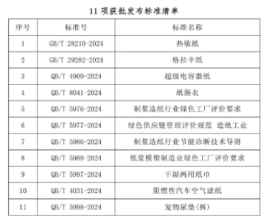 2024年,造紙標(biāo)委會(huì)繼續(xù)堅(jiān)持以行業(yè)需求為導(dǎo)向,不斷深化和完善造紙工業(yè)標(biāo)準(zhǔn)體系,引領(lǐng)造紙行業(yè)綠色、高質(zhì)量發(fā)展。截止目前,共有11項(xiàng)國家和行業(yè)標(biāo)準(zhǔn)獲批發(fā)布,19項(xiàng)國家和行業(yè)標(biāo)準(zhǔn)制修訂計(jì)劃批準(zhǔn)下達(dá)。