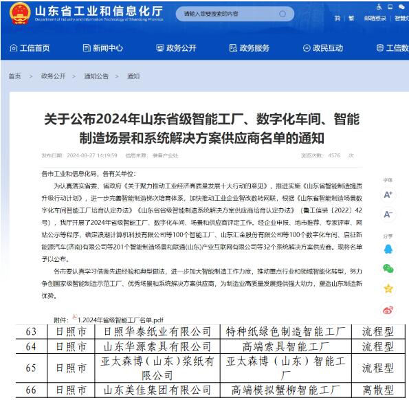 8月27日,山東省工業和信息化廳公布了“關于公布2024年山東省級智能工廠、數字化車間、智能制造場景和系統解決方案供應商名單的通知”,亞太森博(山東)漿紙有限公司憑借其卓越的智能制造實力和創新能力,成功入選省級智能工廠。這一榮譽不僅是對公司在智能制造領域取得成就的高度認可,也是對公司未來發展潛力的充分肯定。