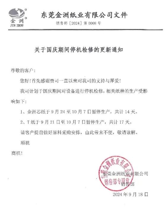 東莞金洲紙業(yè):金洲芯紙于9月24至10月7日暫停生產(chǎn),共計14天;T紙于9月21日至10月7日暫停生產(chǎn),共計17天。