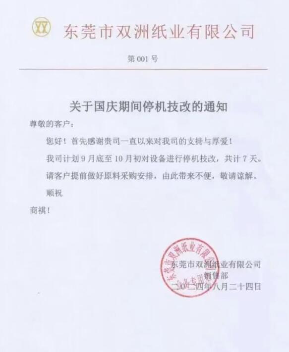 東莞市雙洲紙業(yè):計劃9月底至10月初對設備進行停機技改,共計7天。