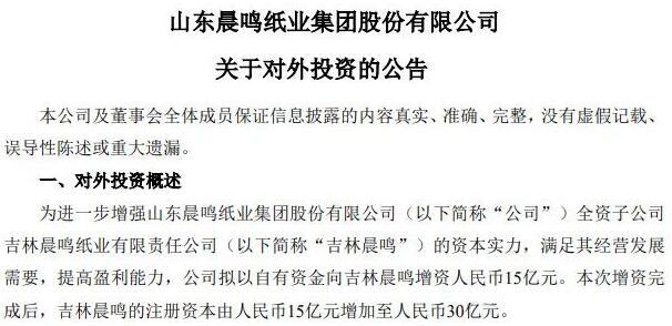 晨鳴紙業(yè)(000488)9月19日晚間公告,為進(jìn)一步增強(qiáng)公司全資子公司吉林晨鳴紙業(yè)有限責(zé)任公司(簡(jiǎn)稱(chēng)“吉林晨鳴”)的資本實(shí)力,滿(mǎn)足其經(jīng)營(yíng)發(fā)展需要,公司擬以自有資金向吉林晨鳴增資15億元。增資完成后,吉林晨鳴的注冊(cè)資本由15億元增至30億元。