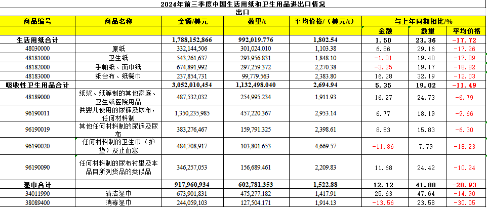 根據海關統計數據,2024年前三季度,中國生活用紙產品繼續呈現貿易順差走勢,并且出口量顯著增長。吸收性衛生用品及濕巾的進口量持續減少,出口業務保持增長。各類產品具體進出口情況分析如下: