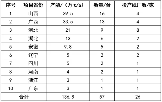 根據(jù)生活用紙委員會秘書處調(diào)研匯總,2024年1—9月,行業(yè)新投產(chǎn)現(xiàn)代化產(chǎn)能約136.8萬t/a,共57臺紙機,包括國產(chǎn)紙機53臺,進口紙機4臺。其中,第一季度投產(chǎn)42.8萬t/a,第二季度投產(chǎn)26.5萬t/a、第三季度投產(chǎn)67.5萬t/a。 第三季度新投產(chǎn)產(chǎn)能比第二季度大幅增加41萬t/a、同比(2023年第三季度投產(chǎn)35.7萬t/a)大幅增加約32萬t/a,使2024年前三季度與2023年同期投產(chǎn)116.7萬t/a相比,增加約20萬t/a。 2024年前三季度新投產(chǎn)產(chǎn)能的地區(qū)分布見表1. 表1 2024年前三季度生活用紙行業(yè)投產(chǎn)現(xiàn)代化產(chǎn)能地區(qū)排序