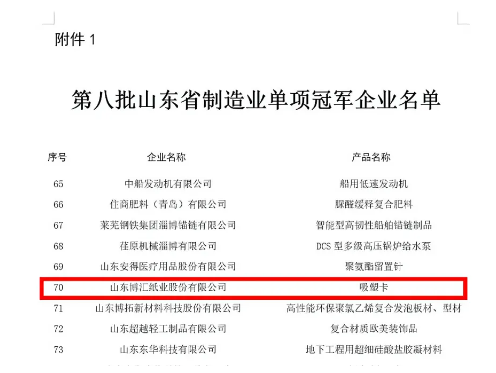 12月4日,山東省工業和信息化廳公布第八批山東省制造業單項冠軍企業名單,共確定358家企業為第八批山東省制造業單項冠軍企業,其中淄博市28家企業上榜。山東博匯紙業股份有限公司吸塑卡產品成功入圍。 據悉,省級制造業單項冠軍企業評選是根據《山東省關于加快培育發展制造業優質企業的實施意見》和《關于開展2024年山東省制造業單項冠軍企業遴選和復核評價的通知》要求,在企業自愿申報、各市工業和信息化局推薦的基礎上,經限定性條件論證審核、行業審查、專家論證、現場核查、網上公示等程序而確定。制造業單項冠軍企業是國家實施制造強國戰略的重要支撐,是推動制造業高質量發展的重要力量。