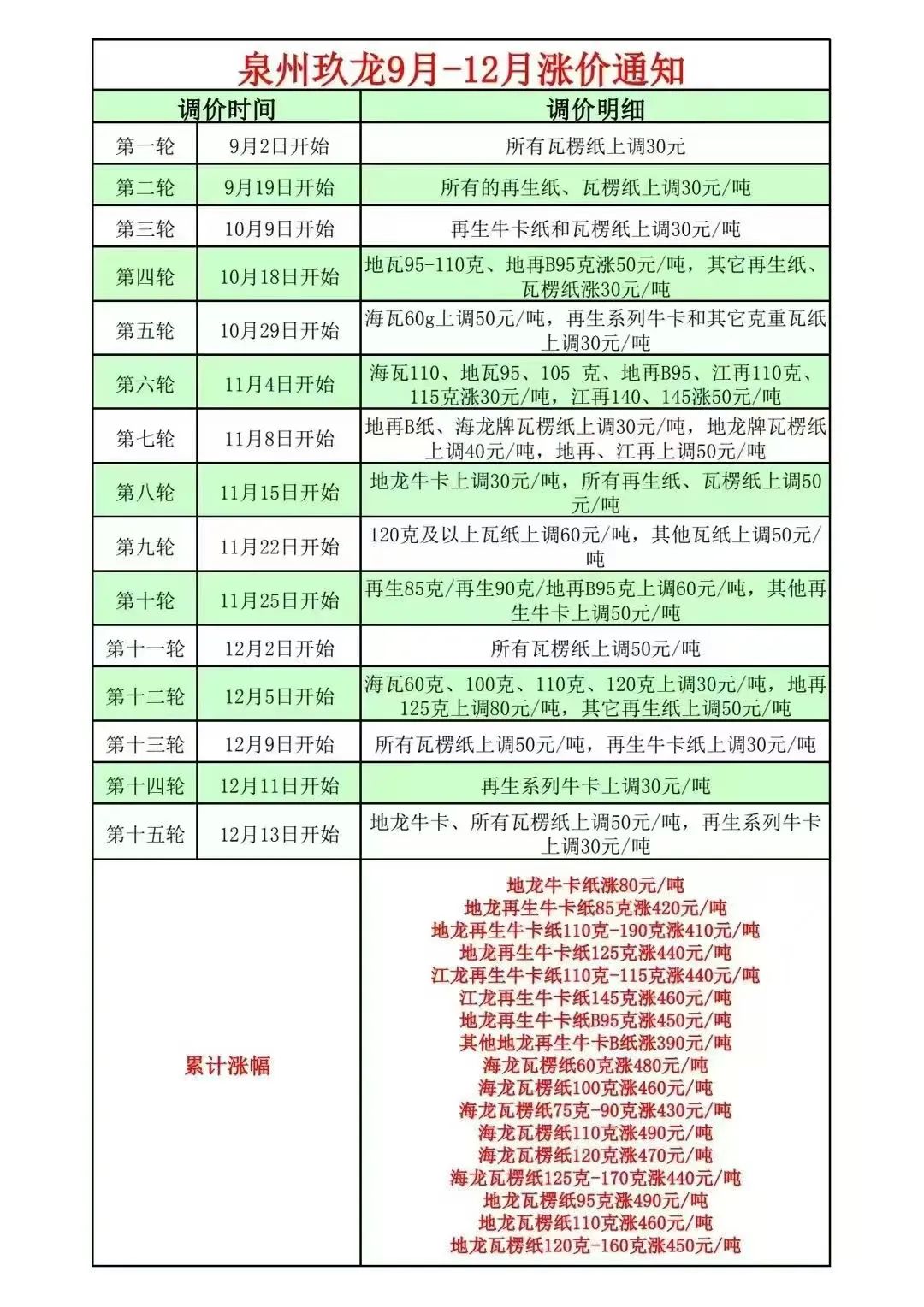 玖龍7大基地漲價計(jì)劃 天津玖龍: 1、12月16日開始,再生90-110克上調(diào)70元/噸,江牛上調(diào)30元/噸,再生、瓦紙上調(diào)50元/噸。 2、12月18日開始,玖牛、海優(yōu)、海牛、地牛上調(diào)30元/噸,地龍優(yōu)質(zhì)/海龍 B、灰底白上調(diào)50元/噸。 河北玖龍: 1、12月16日開始,江龍牛卡上調(diào)60元/噸,再生紙、地瓦上調(diào)50元/噸,玖瓦上調(diào)70元/噸。 2、12月18日開始,地龍優(yōu)質(zhì)120克上調(diào)80元/噸,地龍優(yōu)質(zhì)140-180克上調(diào)50元/噸,地龍牛卡上調(diào)30元/噸。 東莞玖龍: 1、12月11日起,地牛及以上檔次牛卡所有克重上調(diào)50元/噸(白面牛卡、涂布牛卡價格不變);地瓦85g、100g、110g,玖瓦90g上調(diào)50元/噸; 2、12月13日起,地龍牛卡、瓦紙上調(diào)50元/噸、再生系列牛卡上調(diào)30元/噸。 3、12月16日起,所有紙種上調(diào)50元/噸。 太倉玖龍: 1、12月13日起,江再63g漲80元/噸,其他再生紙上漲30元/噸;瓦紙80g及以下漲50元/噸、105g漲60元/噸、115g漲50元/噸、其余克重漲30元/噸。 2、12月16日起,海牛、海T、地牛、地T、再生、瓦紙漲50元/噸;地優(yōu)漲30元/噸;灰底白板紙地龍、江龍、江龍B漲50元/噸。 泉州玖龍: 1、12月11日起,再生系列牛卡上調(diào)30元/噸。 2、12月13日起,地龍牛卡、瓦紙上調(diào)50元/噸、再生系列牛卡上調(diào)30元/噸。 北海玖龍: 1、12月11日起,海優(yōu)V、地優(yōu)v、地優(yōu)、地牛漲50元/噸。 2、12月16日起,所有紙種漲50元/噸。 湖北玖龍: 12月11日起,上調(diào)所有牛卡紙價格50元/噸。 15漲!泉州玖龍9-12月漲價合集
