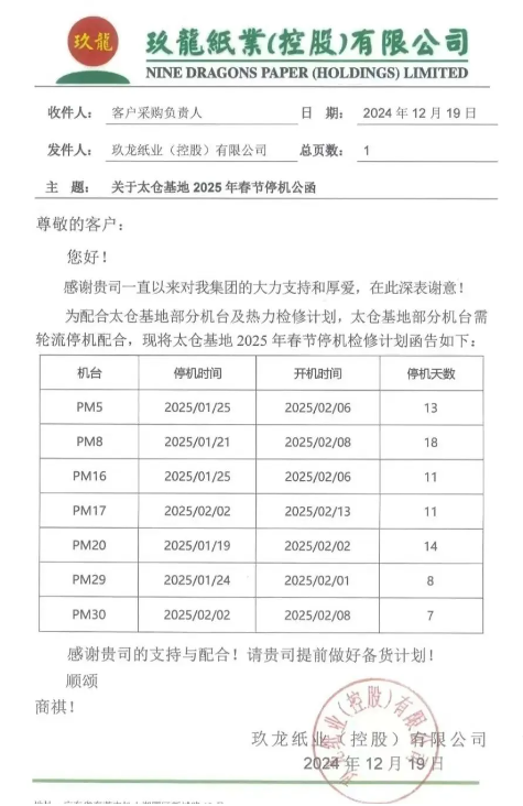 漲價風潮再掀波瀾,2025年首波漲價通知花落文化紙行業,是否與您的預期不謀而合?此外,玖龍紙業太倉和重慶基地春節停機計劃公布,預計減產14萬噸包裝紙。 玖龍紙業太倉和重慶基地春節停機計劃公布 隨著春節假期臨近,玖龍紙業多個基地陸續發布了2025年春節檢修計劃。除了東莞基地1月底至2月中旬將減產17.5萬噸(拓展閱讀:東莞玖龍2025年春節停機時間公布),太倉和重慶基地的大多數紙機也將在同期開展檢修,預計包裝紙市場供應合計削減約14.3萬噸。