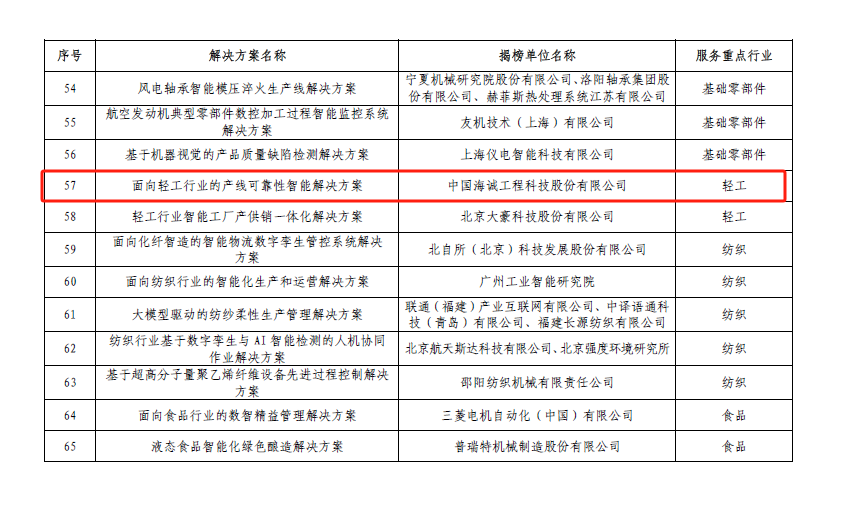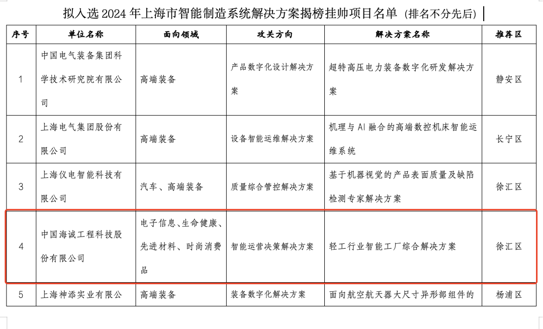近日,中國海誠“輕工行業(yè)智能工廠解決方案”入選上海市經(jīng)濟(jì)與信息化委員會(huì)公布的2024年度上海市智能制造系統(tǒng)解決方案“揭榜掛帥”項(xiàng)目。