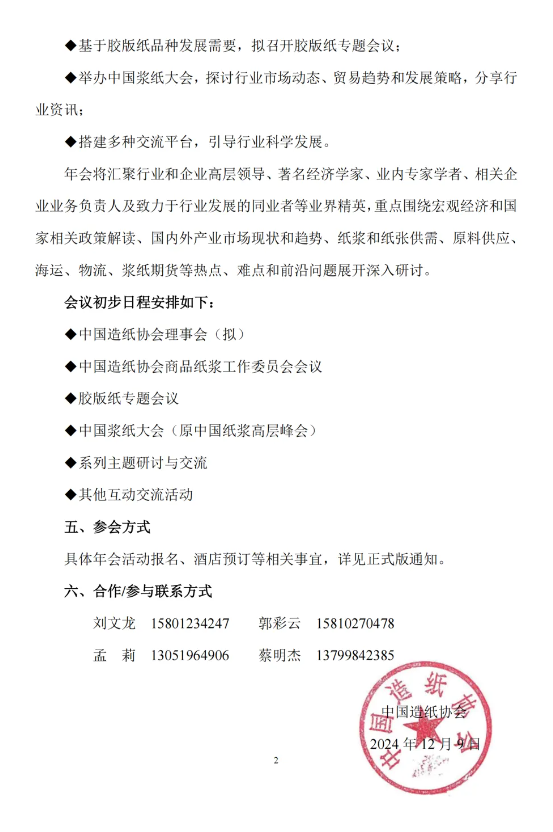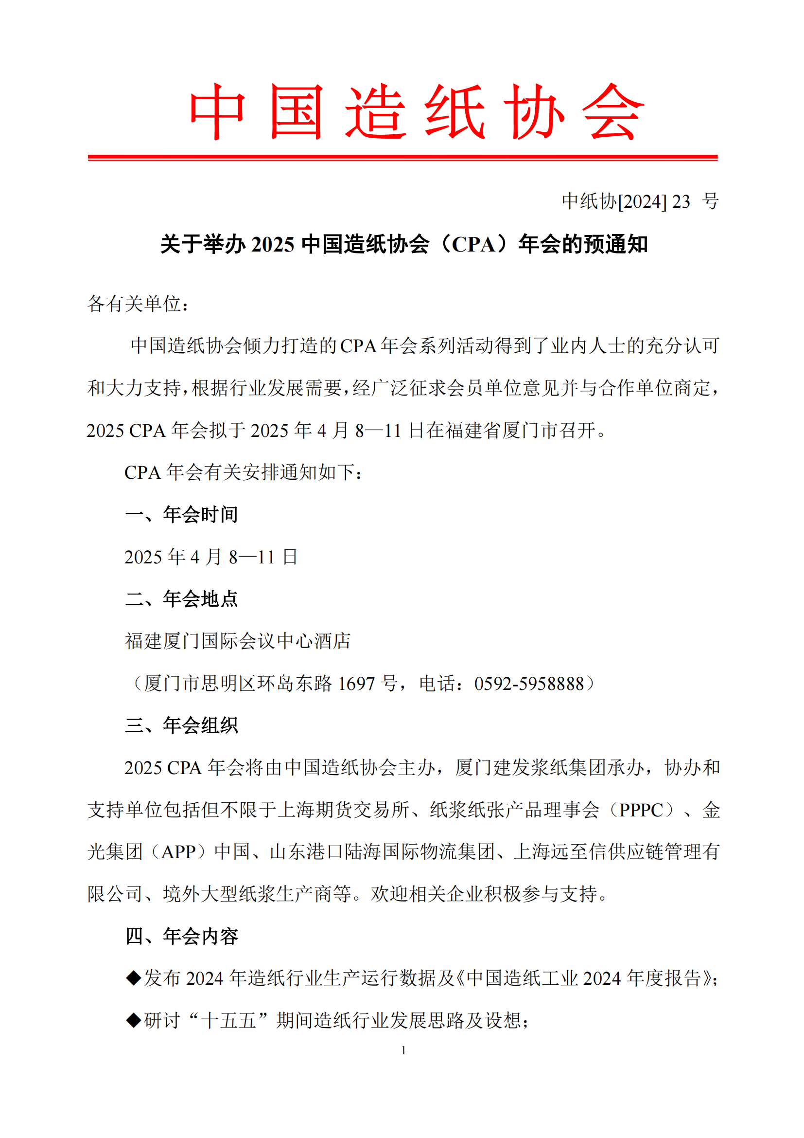 現將“關于舉辦2025 中國造紙協會(CPA)年會的預通知”發送給大家,敬請予以關注!