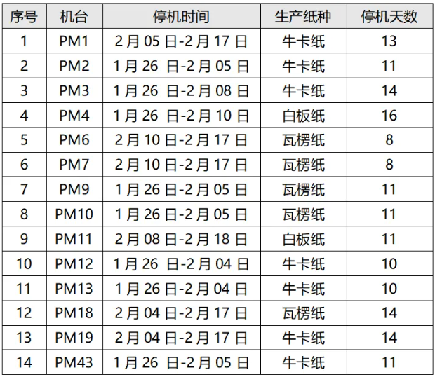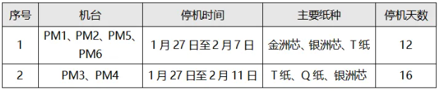 近期,廣東省造紙行業協會根據各企業公告和媒體報導的信息進行收集整理,匯總了截至2025年1月10日部分造紙企業公布的2024年春節停機檢修情況。詳見下表,信息僅供參考。