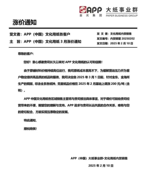 APP(中國)事業群·文化用紙內貿銷售:由于原輔材料價格持續高位運行,我司原紙成本居高不下,為緩解營運壓力并為客戶穩定提供高品質的紙品和服務,我司決定自2025年3月1日起,針對金東、金海所生產的銅版、非涂全系各紙種、克重紙品價格在 2025年2月基礎上調漲200 元/噸(含稅)。