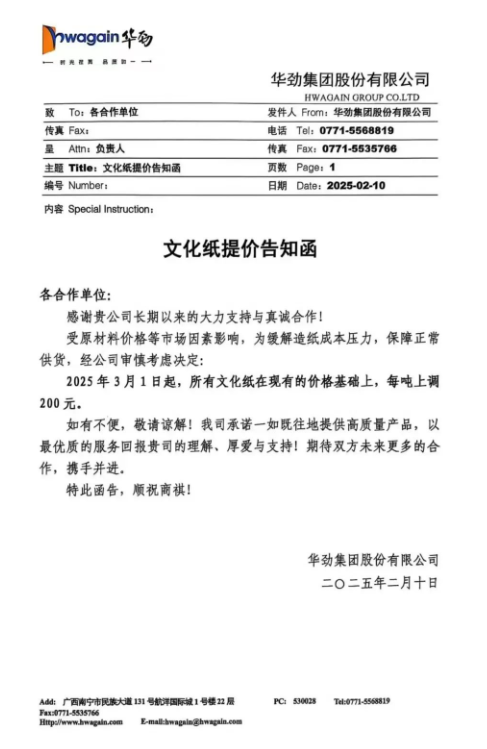 華勁集團:受原材料價格等市場因素影響,為緩解造紙成本壓力,保障正常供貨,經公司審慎考慮決定:2025年3月1日起,所有文化紙在現有的價格基礎上,每噸上調200元。