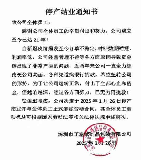 近日,一則令人唏噓的消息在包裝印刷行業引起廣泛關注——專注于紙品包裝業務的深圳市正泰紙制品包裝有限公司,在2025年春節前夕宣布停產結業。