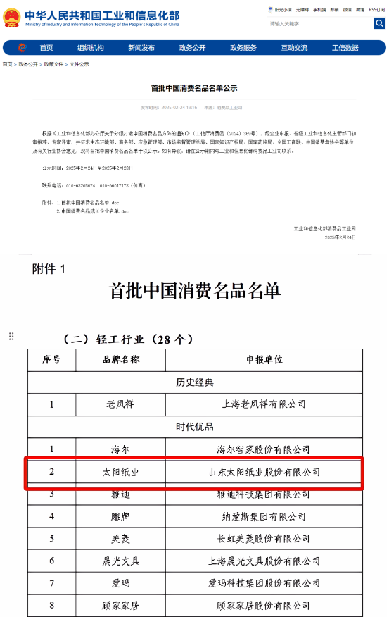 2025年2月24日,工業(yè)和信息化部消費(fèi)品工業(yè)司公示了首批中國(guó)消費(fèi)名品名單,山東太陽紙業(yè)股份有限公司憑借優(yōu)秀的產(chǎn)品質(zhì)量、創(chuàng)新能力和品牌影響力成功入選。