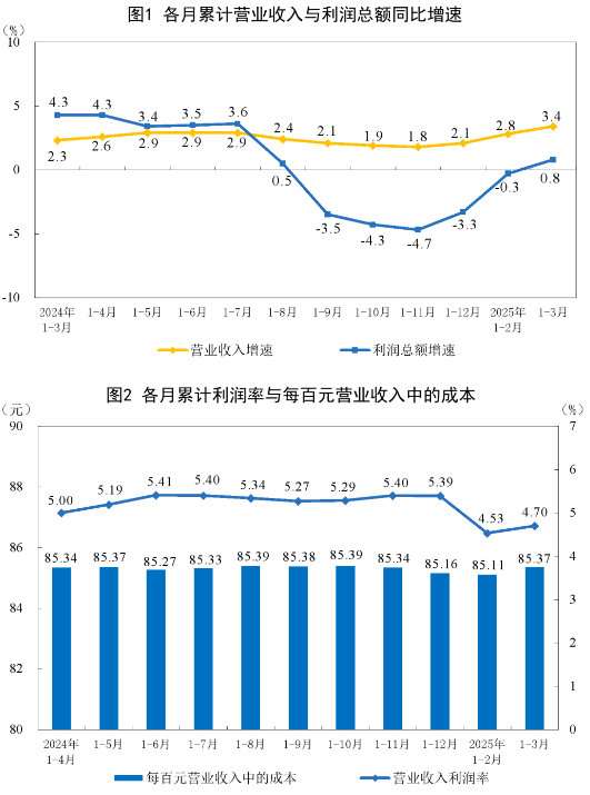 1—3月份,規(guī)模以上工業(yè)企業(yè)實(shí)現(xiàn)營業(yè)收入32.14萬億元,同比增長3.4%;發(fā)生營業(yè)成本27.44萬億元,增長3.6%;營業(yè)收入利潤率為4.70%,同比下降0.12個(gè)百分點(diǎn)。