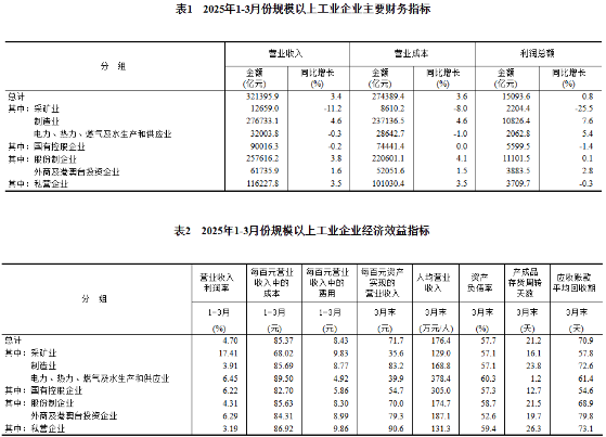4月27日,國家統(tǒng)計(jì)局網(wǎng)站發(fā)布2025年1—3月份全國規(guī)模以上工業(yè)企業(yè)利潤情況。數(shù)據(jù)顯示,1—3月份,全國規(guī)模以上工業(yè)企業(yè)實(shí)現(xiàn)利潤總額15093.6億元,同比增長0.8%。
