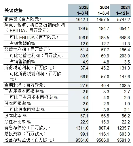 2025年1-3月 (2024年1-3月同比數(shù)據(jù)) 銷售額為16.42億歐元(同比:14.57億歐元) 經(jīng)營性利潤為5100萬歐元(同比:5800萬歐元);可比經(jīng)營性利潤為8100萬歐元(7000萬歐元) 稅前利潤為3700萬歐元(同比:4500萬歐元);可比稅前利潤為6700萬歐元(同比:5700萬歐元) 可比已占用資本回報率為4.4%(同比:4.0%) 經(jīng)營性凈現(xiàn)金流為-1000萬歐元(同比:-1.37億歐元) 2025年第一季度主要事件 與2024年第四季度相比,芬林集團商品針葉漿在歐洲的平均銷售價格持平,在中國的平均銷售價格上漲了3%。 歐洲和北美市場對商品針葉漿的需求保持穩(wěn)定。在中國,年初的需求水平較好,但在三月份有所下降。由于之前的產(chǎn)能關(guān)停,全球針葉漿供應(yīng)量有所下降。 芬林集團的紙板交付量比上一季度有所增加。紙板平均價格與 2024 年基本持平。 芬林紙板決定關(guān)閉芬蘭塔科(Tako )紙板廠,同時將提高基洛(Kyro) 紙板廠的運營效率。 芬林集團于2月啟動了 Kuura 紡織纖維廠的前期工程,為其工業(yè)化生產(chǎn)做準備。 位于德國的克勞紹(Kreuzau)生活用紙廠正在進行產(chǎn)能調(diào)整和設(shè)備更新計劃。芬蘭曼塔(Mänttä )生活用紙廠正在投資用于原生纖維加工以及設(shè)備更新,并計劃逐步淘汰回收纖維的使用。目前這兩家工廠均在進行變更談判。 萬赫寧(Jussi Vanhanen)將于 2025 年 7 月 1 日起擔任芬林集團首席執(zhí)行官。 2025年4-6月的業(yè)績展望 2025 年 4 月至 6 月,芬林集團的可比經(jīng)營性利潤預(yù)計將低于 2025 年 1 月至 3 月。