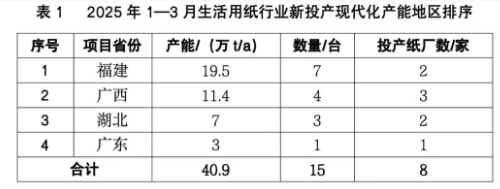 根據生活用紙專業委員會秘書處調研匯總,2025年1—3月,生活用紙行業新投產現代化產能約40.9萬t/a,共15臺紙機,包括國產紙機12臺,進口紙機3臺。今年第一季度新投產產能與去年同期(42.8萬t/a)相比,基本持平。 2025年第一季度新投產產能的地區分布見表1.