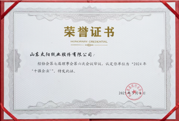 2025年5月8日-9日,以“創新驅動、綠色發展”為主題的“2025山東省造紙行業年會暨山東省造紙產業綠色低碳高質量發展大會”在山東德州成功召開。會上,中國造紙協會副理事長、山東省造紙行業協會專職副會長趙振東宣讀了《山東協會認定“雙十”標桿企業——山東省造紙行業協會“2024年‘十強企業’‘十佳企業’”通報》,其中,山東太陽紙業股份有限公司被認定為“2024年‘十強企業’”。