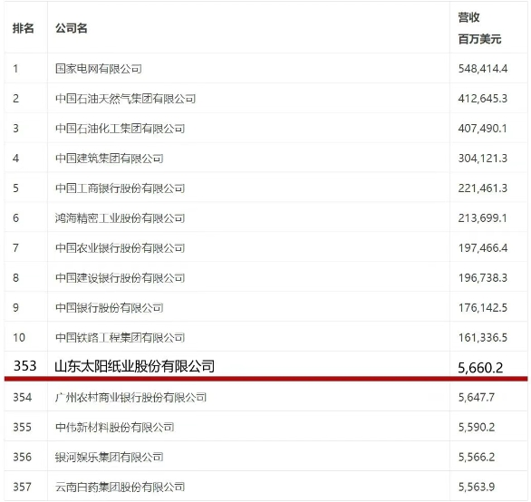 7月22日,財富中文網(wǎng)發(fā)布了2025年《財富》中國500強排行榜,山東太陽紙業(yè)股份有限公司以56.6億美元的營業(yè)收入位列第353位,較去年排名躍升27位。