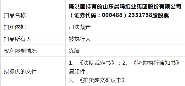 拍品介紹 拍賣對象:陳洪國持有的山東晨鳴紙業集團股份有限公司(證券代碼:000488)2331738股股票 特殊說明: 1.起拍價說明:起拍價以拍賣日前20個交易日的收盤價均價(MA20)*70%確定,平臺公示價格為展示價格,非實際價格,實際起拍價在起拍日前進行調整,請意向競買人注意,起拍價、成交價均不含買賣雙方交易的稅款及各種費用、欠費。 2.本次拍賣的標的物為上市公司股票,標的物的價值受市場行情等因素影響較大,專業性較強,有意者請自行咨詢專業機構,本院不承擔本拍品的瑕疵保證。股票過戶相關限制政策請自行咨詢證券管理機構。 3.法律行政法規等禁止持有、買賣上市公司股票的法人或者自然人不得參加競買; 4.法人或者自然人具有法律、行政法規規定及證監會認定的不得收購上市公司情形的,不得參加競買; 5.競買人及其一致行動人已經持有的該上市公司股票數額和其競買的股份數額累計不得超過該上市公司已發行股份數額的30%。如競買人及其一致行動人累計持有該上市公司股份數額已經達到30%仍參與競買的,競買人應當特別向法院提出書面申請、報告,并按照《中華人民共和國證券法》及中國證券監督管理委員會《上市公司收購管理辦法》的相關規定辦理,在此期間,本院依法應當中止拍賣程序; 6.因股票總價值較高,參拍出價需謹慎,一旦競買成功,悔拍將承擔嚴重不利后果; 7.股票過戶產生的稅費及相關費用(包括欠費等)和未明確繳費義務人的費用應當依照相關法律、行政法規的規定,由相應主體承擔。買受人先行墊付的稅費可另行追償。無明確規定的稅費由買受人承擔。 8. 股票過戶相關限制政策,請咨詢證券管理機構政策規定; 9.買受人競買成交并過戶后,其權利義務受證券法等法律法規約束; 10.本公告對標的物的描述內容僅供參考,具體以現場實際情況及實際存在的法律關系現狀為準,委托人和本公司均不就此承擔任何責任。案涉標的物所有信息,意向競買人請自行查詢,了解此標的物相關信息。競買人決定參與競買的視為對拍賣財產完全了解,并接受拍賣案涉標的的一切已知和未知瑕疵。 公司一季度財報顯示,陳洪國是公司第五大股東,目前持股19.080.044股,全部處于凍結狀態。本次拍賣的股票占陳洪國所持股份的12.22%。 掛牌信息顯示,此番拍賣的依據是北京市東城區人民法院執行裁定書。根據裁定書,申請執行人為北京格恩美醫療科技有限公司,被執行人為陳洪國,以及山東晨鳴紙業銷售有限公司、晨鳴紙業。 去年11月,晨鳴紙業曾披露公告稱,陳洪國因個人原因申請辭去公司董事、董事長,選舉胡長青為公司新任董事長。同時,陳洪國妻子李雪芹也因到齡退休,申請辭去副總經理職務,辭職后,將不在公司任職。