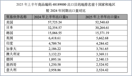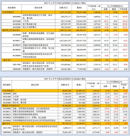 生活用紙 出口 2025年上半年,生活用紙出口量77.83萬(wàn)t,較2024年同期增長(zhǎng)19.06%,出口金額12.19億美元,較2024年同期下降1.77%,呈現(xiàn)量增價(jià)跌的趨勢(shì)。出口產(chǎn)品仍以成品為主,2025年上半年成品占總出口量的69.41%(2024年上半年為69.06%),較2024年同期有所增長(zhǎng)。成品紙中手帕紙、面巾紙出口量增長(zhǎng)最快,為33.86%。 進(jìn)口 2025年上半年,生活用紙總進(jìn)口量比2024年同期有所增長(zhǎng),但進(jìn)口量很少,只有2.23萬(wàn)t;進(jìn)口產(chǎn)品中仍然以原紙為主,占總進(jìn)口量的90.57%。 吸收性衛(wèi)生用品 出口 2025年上半年,吸收性衛(wèi)生用品的總出口量為84.04萬(wàn)t,出口金額為22.03億美元,均保持雙位數(shù)增長(zhǎng),分別增長(zhǎng)16.01%和11.00%。出口產(chǎn)品中仍以嬰兒紙尿褲為主,占出口總量的42.83%,嬰兒紙尿褲出口量為35.99萬(wàn)t,同比增長(zhǎng)24.07%。 其中,寵物墊、護(hù)理墊等衛(wèi)生用品出口對(duì)應(yīng)的商品編碼48189000(紙漿、紙等制的其他家庭、衛(wèi)生或醫(yī)院用品)下的產(chǎn)品出口量,2025年上半年較2024年同期減少4.068.60t,為近年來(lái)首次下降,分析原因是美國(guó)加征關(guān)稅對(duì)我國(guó)二季度出口帶來(lái)一定的影響,該編碼下產(chǎn)品出口目的地排名第一的美國(guó)的出口量2025年上半年較2024年同期減少5.184.61t。