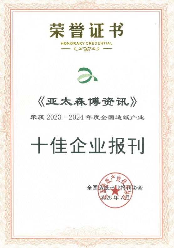公司企業文化內刊《亞太森博資訊》在眾多參評企業報刊中脫穎而出,榮獲2023-2024年度全國造紙產業“十佳企業報刊”稱號;