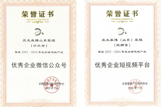 公司微信公眾號“亞太森博山東漿紙”被評為2023-2024年度全國造紙產業“優秀企業微信公眾號”; 公司視頻號“亞太森博山東漿紙”被評為2023-2024年度全國造紙產業“優秀企業短視頻平臺”。