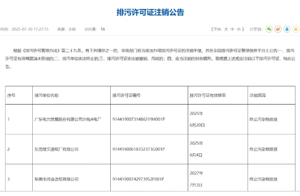 近日,東莞生態(tài)環(huán)境局官網(wǎng)發(fā)布公告稱,東莞理文造紙廠有限公司、東莞市鴻業(yè)造紙有限公司的排污許可證分別于2025年6月4日和2027年7月3日到期。