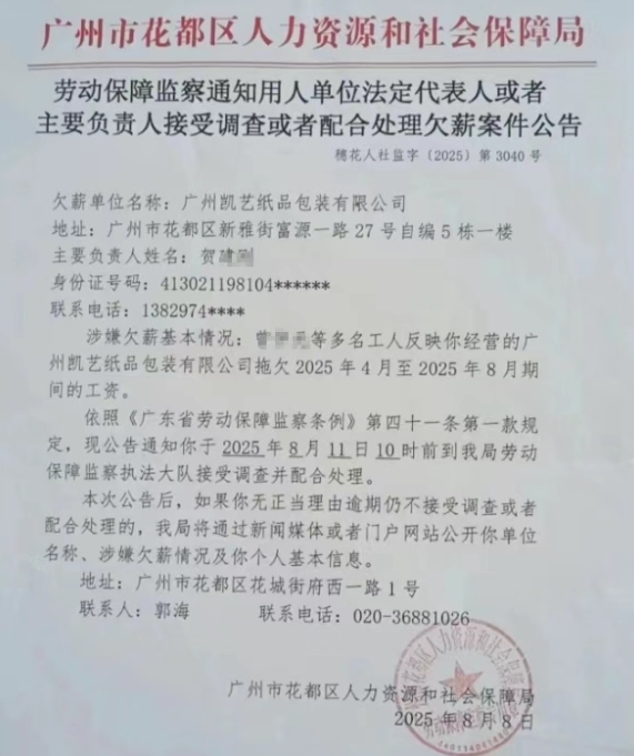 然而,面對(duì)成本不斷攀升、業(yè)務(wù)持續(xù)下滑等多重壓力,廣州凱藝紙品的資金問題逐漸浮出水面。在廣州市花都區(qū)人力資源和社會(huì)保障局于8月8日發(fā)布的一份公告顯示,該公司因拖欠2025年4月至2025年8月期間的工資,被要求接受調(diào)查并配合處理。