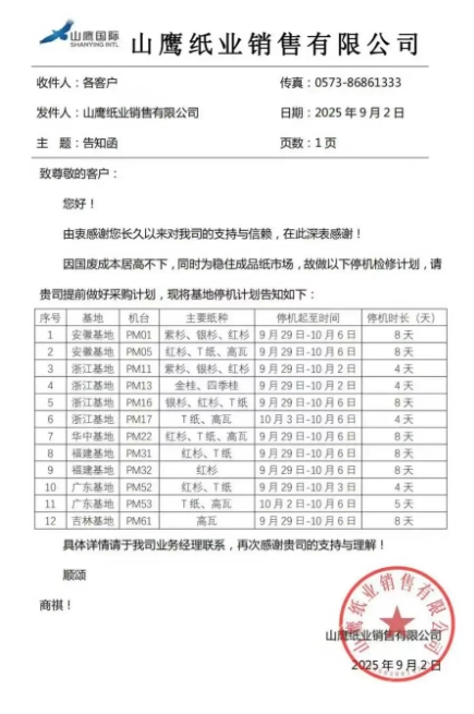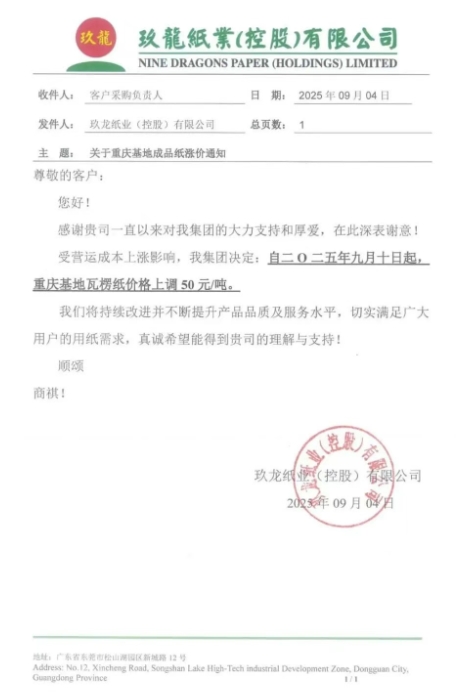 在目前的銷售價格基礎上,從2025年9月12日起,我公司生產的再生牛卡/高強瓦楞紙銷售價格上調30元/噸。