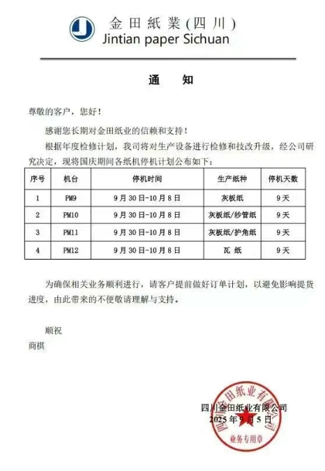 自2025年9月8日起,對四川金田紙業有限公司所產的所有高強瓦楞紙在原價格基礎上統一上漲50元/噸。