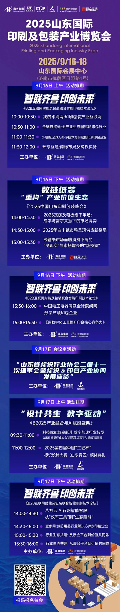 2025海名山東(濟南)國際印刷及包裝產業博覽會將于2025年9月16日-18日在山東國際會展中心(濟南槐蔭區)舉辦!本屆展會由海名集團主辦,青島海名國際會展有限公司承辦,由中山市印刷包裝行業協會、甘肅省包裝技術協會、天津市包裝技術協會、山東省標識行業協會、青島市包裝聯合會、威海市包裝印刷工業協會、煙臺市印刷包裝協會、煙臺市包裝行業協會、濰坊市印刷協會、玉田縣印刷包裝機械協會、東光縣紙箱包裝機械制造聯合會、商河縣印刷包裝行業商會等眾多行業協會大力支持協同組織。