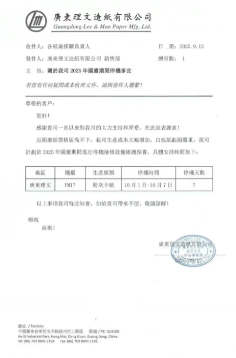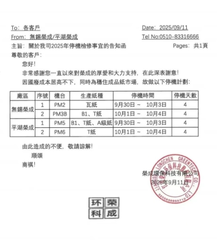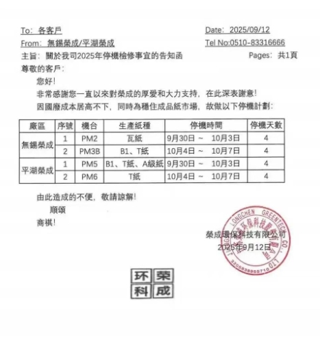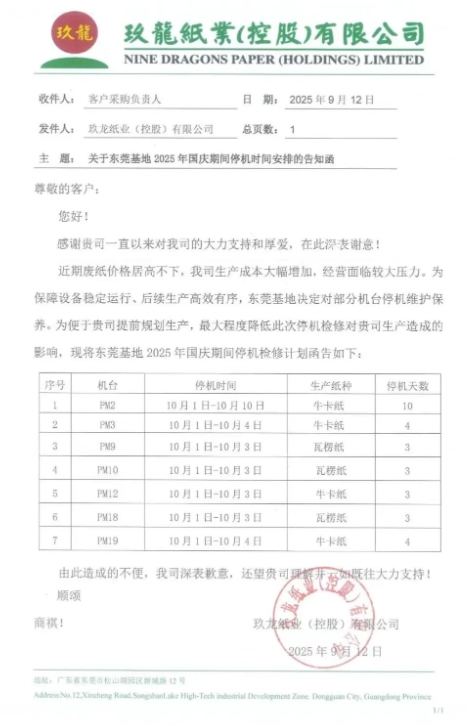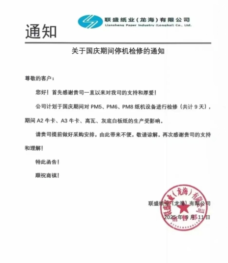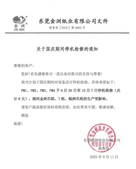 •淄博永豐環(huán)?萍加邢薰 自2025年9月13日起,瓦楞紙、環(huán)保紙、牛卡紙價(jià)格在原有價(jià)格基礎(chǔ)上上調(diào)30元。 •山東仁豐特種材料股份有限公司 自2025年9月13日開始,瓦楞紙?jiān)谠袃r(jià)格基礎(chǔ)上上調(diào)30元/噸。 •玖龍紙業(yè)東莞基地 自九月十八日起,東莞基地地龍?jiān)偕?、江龍(jiān)偕?、玖龍瓦楞紙、地龍瓦楞紙上調(diào)RMB/HKD30元/噸(USD4元/噸)。 •浙江金龍?jiān)偕Y源科技股份有限公司、浙江金勵(lì)環(huán)保紙業(yè)有限公司 在目前的銷售價(jià)格基礎(chǔ)上,從2025年9月15日起,我公司生產(chǎn)的再生?/高強(qiáng)瓦楞紙銷售價(jià)格上調(diào)30元/噸。 •上海珀菲特包裝科技有限公司 從2025年9月11日17:00時(shí)起,所有紙板訂單在原價(jià)格的基礎(chǔ)上上調(diào)3%。 •上海瑞邦紙品包裝有限公司 自2025年09月12日08:00起,所有紙板訂單價(jià)格在原有基礎(chǔ)上上調(diào)3%(包括多層紙板,二層紙板)。 •上海勇玖包裝材料有限公司 從2025年9月11日16:00時(shí)對(duì)所有客戶所下訂單價(jià)格上漲3%。 •山鷹紙業(yè) 自2025年9月13日起,在原有價(jià)格基礎(chǔ)上: 廣東基地:T紙、瓦紙上調(diào)30元/噸; 自2025年9月15日起,在原有價(jià)格基礎(chǔ)上: 福建基地:紅杉系、瓦紙系上調(diào)50元/噸; •五洲特紙 從2025年9月18日起,針對(duì)集團(tuán)旗下包裝紙系列產(chǎn)品在現(xiàn)有價(jià)格基礎(chǔ)上,上調(diào)30元/噸。 •金田紙業(yè)(東莞) 自2025年09月15日起,對(duì)東莞市金田紙業(yè)有限公司所產(chǎn)的金泊牌再生?、金泊牌高強(qiáng)瓦楞紙?jiān)谠瓋r(jià)格基礎(chǔ)上統(tǒng)一上漲30元/噸。 •金田紙業(yè)(四川) 自2025年9月16日起,對(duì)四川金田紙業(yè)有限公司所產(chǎn)的所有高強(qiáng)瓦楞紙?jiān)谠瓋r(jià)格基礎(chǔ)上統(tǒng)一上漲30元/噸。 •玖龍紙業(yè)太倉基地 自九月十八日起,瓦紙/Y紙/B紙/E紙/T紙?jiān)谀壳皟r(jià)格的基礎(chǔ)上上調(diào)RMB30元/噸。 造紙廠國慶停機(jī)計(jì)劃 •東莞金洲紙業(yè)有限公司