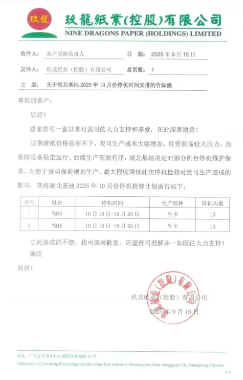 造紙廠最新調價通知 • 玖龍紙業太倉基地 1、自九月二十二日起,太倉基地海龍優質牛卡價格上調50元/噸,地龍優質牛卡價格上調30元/噸。 2、自九月二十六日起,太倉基地瓦楞紙價格上調30元/噸。 • 玖龍紙業泉州基地 自九月二十二日起,泉州基地所有牛卡、瓦楞紙價格上調RMB30元/噸。 • 玖龍紙業重慶基地 自九月二十二日起,重慶基地再生牛卡價格上調50元/噸。 • 山鷹紙業 自9月17日起,在原有價格基礎上: 廣東基地:紅杉、T紙上調50元/噸,瓦紙上調30 元/噸; 自9月20日起,在原有價格基礎上: 浙江、安徽基地:紅杉、T紙、瓦紙上調30元/噸; 自9月22日起,在原有價格基礎上: 福建基地:紅杉系、瓦紙系上調30元/噸; 浙江、安徽基地:紫杉、金杉上調30元/噸。 • 榮成環保 于9月26日起,針對我司T紙/瓦紙上調30元/噸。 造紙廠停機計劃 • 玖龍紙業湖北基地