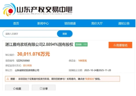 山東產權交易中心信息顯示,山東省財欣投資有限公司(以下簡稱“財欣投資”)自10月24日起掛牌轉讓其持有的湛江晨鳴漿紙有限公司2.8894%股權,轉讓底價3億元。