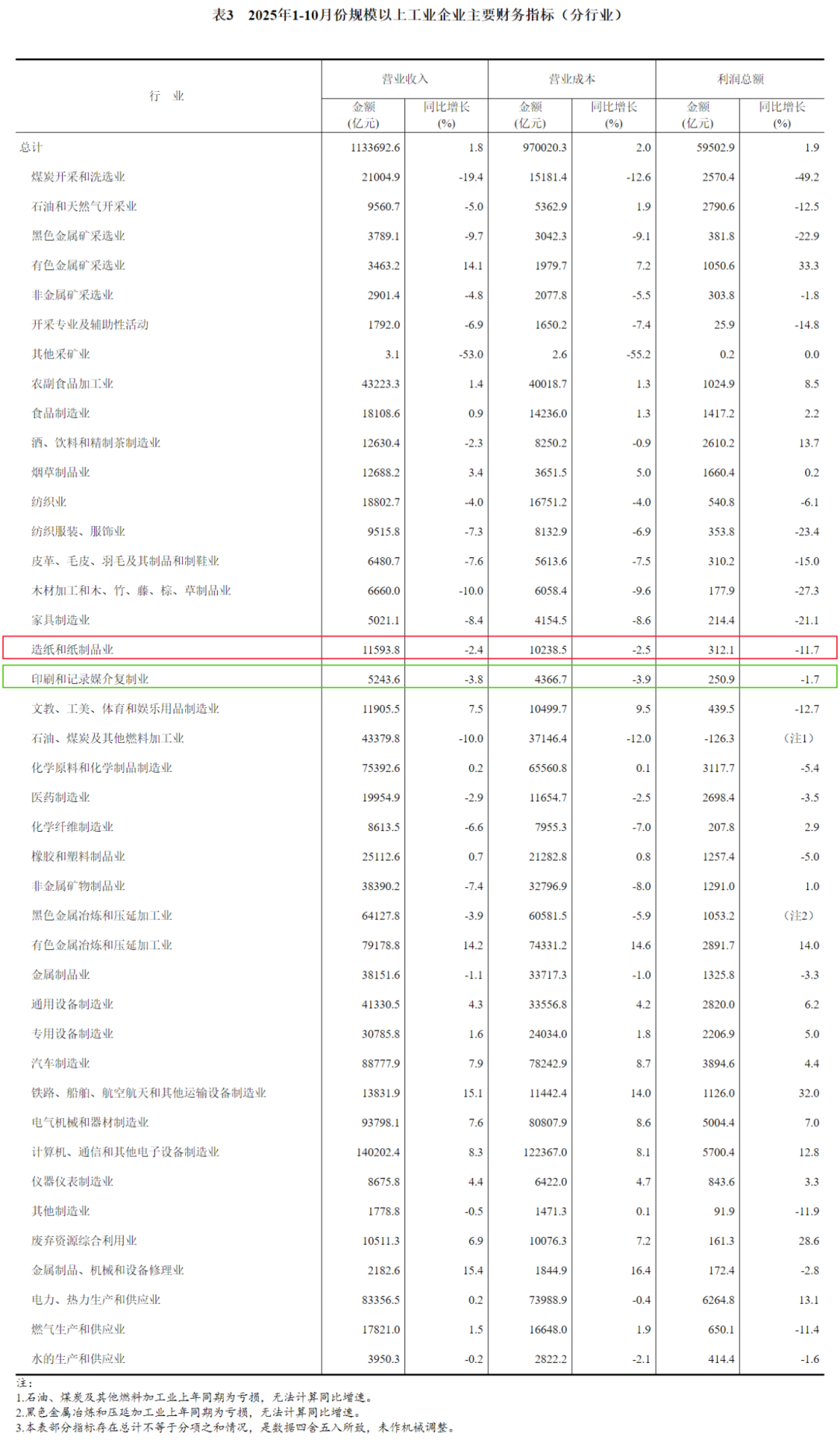 值得關注的是,造紙和紙制品業實現利潤總額312.1億元,同比下降11.7%;印刷和記錄媒介復制業實現利潤總額250.9億元,同比下降1.7%。 1—10月份,規模以上工業企業實現營業收入113.37萬億元,同比增長1.8%;發生營業成本97.00萬億元,增長2.0%;營業收入利潤率為5.25%,同比提高0.01個百分點。其中,造紙和紙制品業實現營業收入11593.8億元,同比下降2.4%;印刷和記錄媒介復制業實現營業收入5243.6億元,同比下降3.8%。 10月末,規模以上工業企業資產總計187.23萬億元,同比增長4.7%;負債合計108.59萬億元,增長5.0%;所有者權益合計78.64萬億元,增長4.3%;資產負債率為58.0%,同比上升0.2個百分點。 10月末,規模以上工業企業應收賬款27.69萬億元,同比增長5.1%;產成品存貨6.82萬億元,增長3.7%。 1—10月份,規模以上工業企業每百元營業收入中的成本為85.56元,同比增加0.17元;每百元營業收入中的費用為8.37元,同比減少0.10元。 10月末,規模以上工業企業每百元資產實現的營業收入為74.5元,同比減少2.2元;人均營業收入為185.9萬元,同比增加5.8萬元;產成品存貨周轉天數為20.4天,同比增加0.4天;應收賬款平均回收期為69.8天,同比增加3.4天。 10月份,規模以上工業企業利潤同比下降5.5%。 國家統計局工業司首席統計師于衛寧解讀2025年1—10月份工業企業利潤數據表示,1—10月份,在黨中央堅強領導下,各地區各部門認真落實黨中央、國務院決策部署,著力做強國內大循環,積極暢通國內國際雙循環,帶動工業企業利潤穩定增長,工業經濟高質量發展穩步推進。主要體現在:工業企業利潤穩定增長;工業企業營收保持增長;裝備制造業利潤較快增長;高技術制造業效益增勢良好;傳統產業提質升級成效顯現等幾大方面。下階段,在國際環境復雜嚴峻,國內周期性結構性矛盾交織的背景下,要深入學習貫徹黨的二十屆四中全會精神,繼續精準落實黨中央、國務院決策部署,推動各項政策協同發力,進一步擴內需、優結構、育新能,推動工業經濟量質齊升、動能煥新,不斷筑牢實體經濟根基。