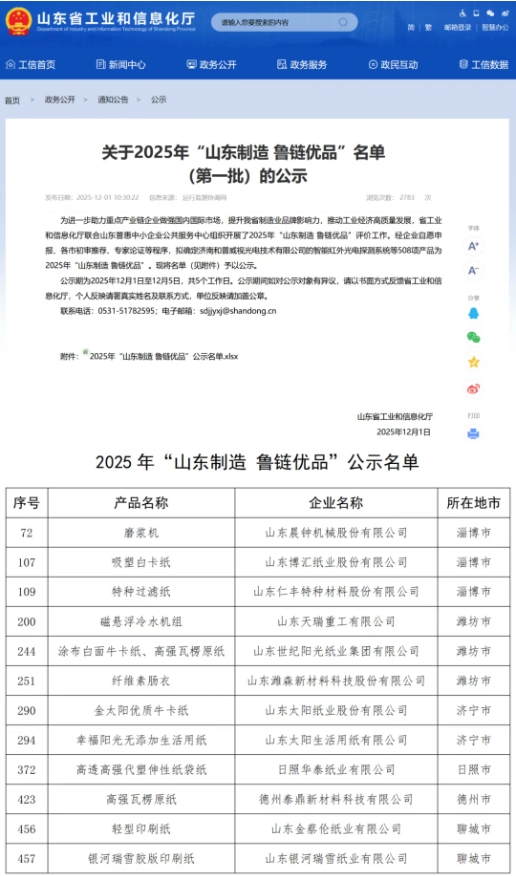 近日,山東省工業和信息化廳發布2025年“山東制造 魯鏈優品”名單(第一批)。其中:山東晨鐘機械股份有限公司、山東博匯紙業股份有限公司、山東仁豐特種材料股份有限公司、山東天瑞重工有限公司、山東世紀陽光紙業集團有限公司、山東濰森新材料科技股份有限公司、山東太陽紙業股份有限公司、山東太陽生活用紙有限公司、日照華泰紙業有限公司、德州泰鼎新材料科技有限公司、山東金蔡倫紙業有限公司和山東銀河瑞雪紙業有限公司的主導產品憑借其卓越品質與創新實力成功入選。