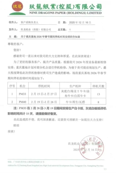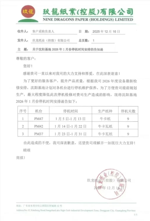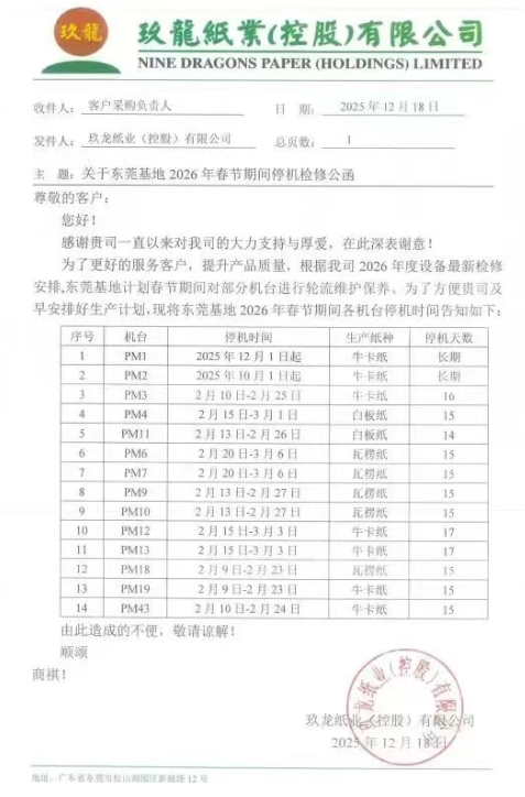 玖龍四大基地、四川金田紙業更新停機計劃