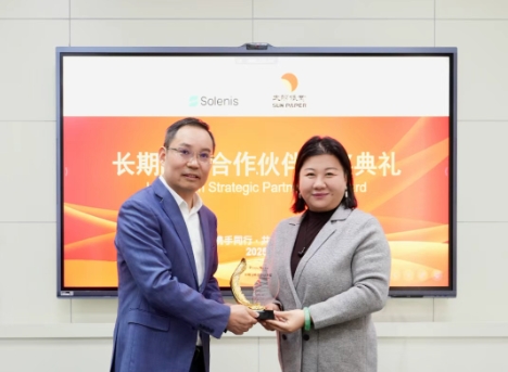 太陽(yáng)紙業(yè)董事長(zhǎng)李娜女士一行到訪索理思亞太區(qū)總部合影 會(huì)上,索理思向太陽(yáng)紙業(yè)頒發(fā)“長(zhǎng)期戰(zhàn)略合作伙伴獎(jiǎng)”,太陽(yáng)紙業(yè)也向索理思授予“2025戰(zhàn)略供應(yīng)商獎(jiǎng)”,標(biāo)志著雙方長(zhǎng)期穩(wěn)定的合作關(guān)系邁入新的發(fā)展階段。多年來(lái),索理思持續(xù)參與并支持太陽(yáng)紙業(yè)在不同發(fā)展階段的業(yè)務(wù),涵蓋制漿過(guò)程化學(xué)品、造紙功能性助劑及過(guò)程性助劑等多個(gè)核心領(lǐng)域,雙方在長(zhǎng)期合作中建立了高度互信的伙伴關(guān)系,始終秉持綠色發(fā)展的理念、合作共贏的企業(yè)精神,共同推動(dòng)制漿造紙行業(yè)的高質(zhì)量發(fā)展。